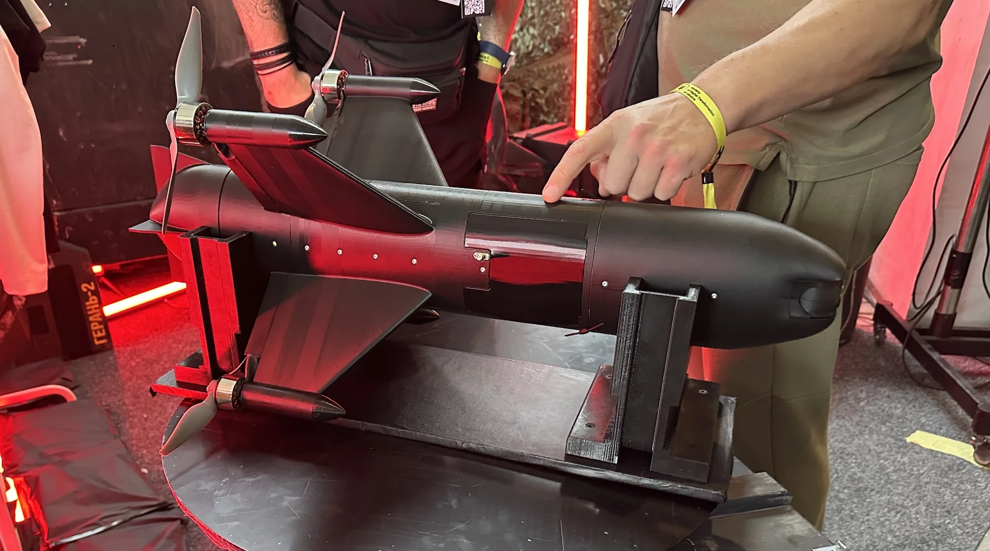 Ein durch eine Einheit der ukrainischen Streitkräfte entwickelter Shahed-Killer auf einer Messe in Lwiw (Ukraine) im September 2025. Ursprünglich hergestellt im 3D-Druck war diese Interceptordrohne anfangs für den Großteil der entsprechenden Einsätze gegen russische Angriffsdrohnen verantwortlich.