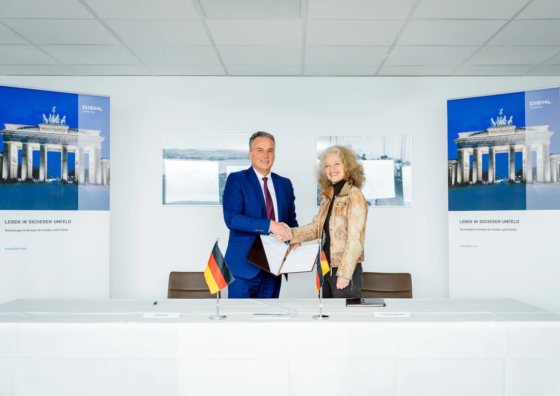 Die Präsidentin der Universität der Bundeswehr München, Prof. Dr. mont. Dr.-Ing. habil. Eva-Maria Kern, und Diehl Defence CEO Helmut Rauch haben gestern im Rahmen eines Besuchs am Standort Überlingen eine gemeinsame Absichtserklärung unterzeichnet.