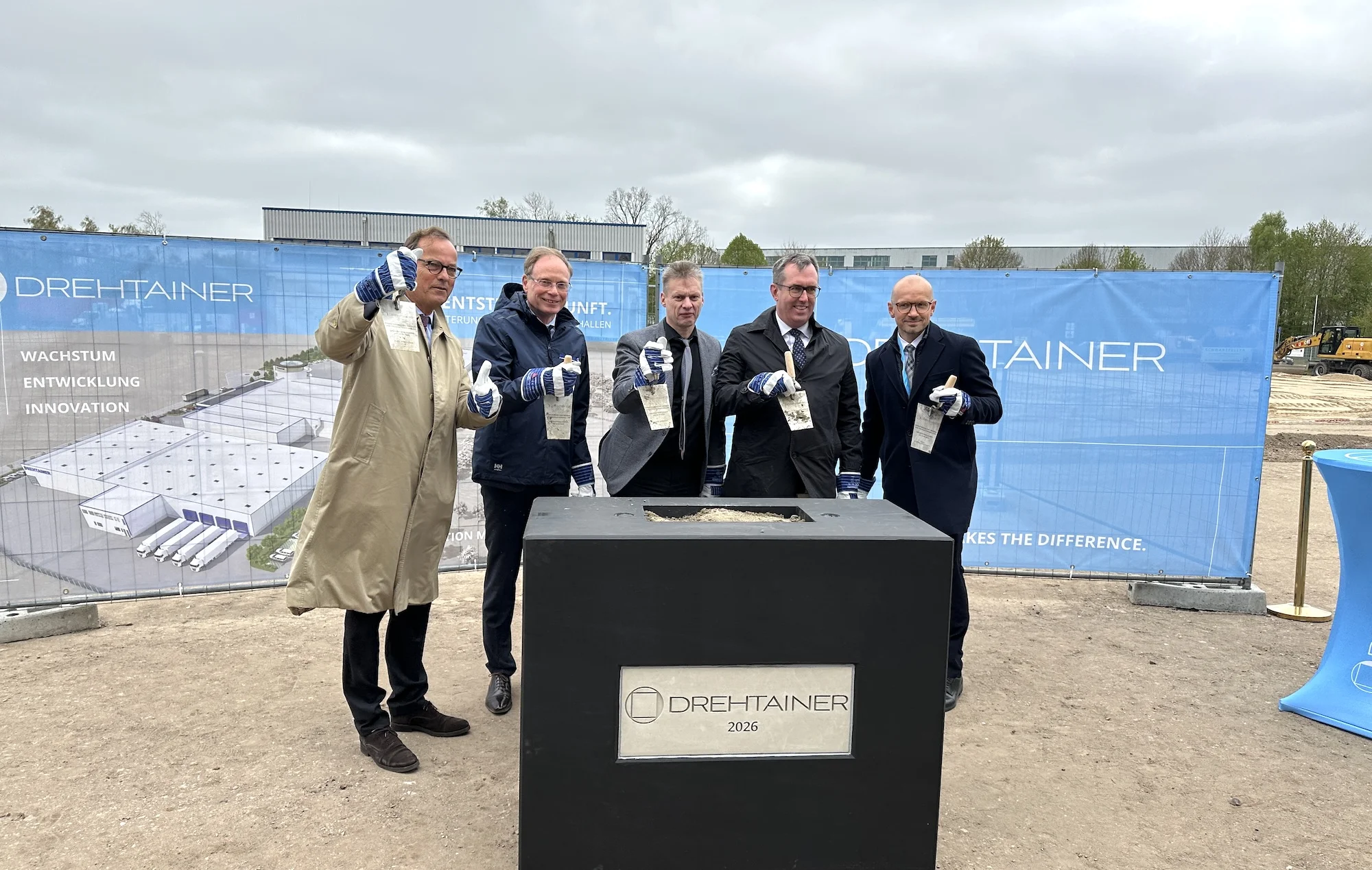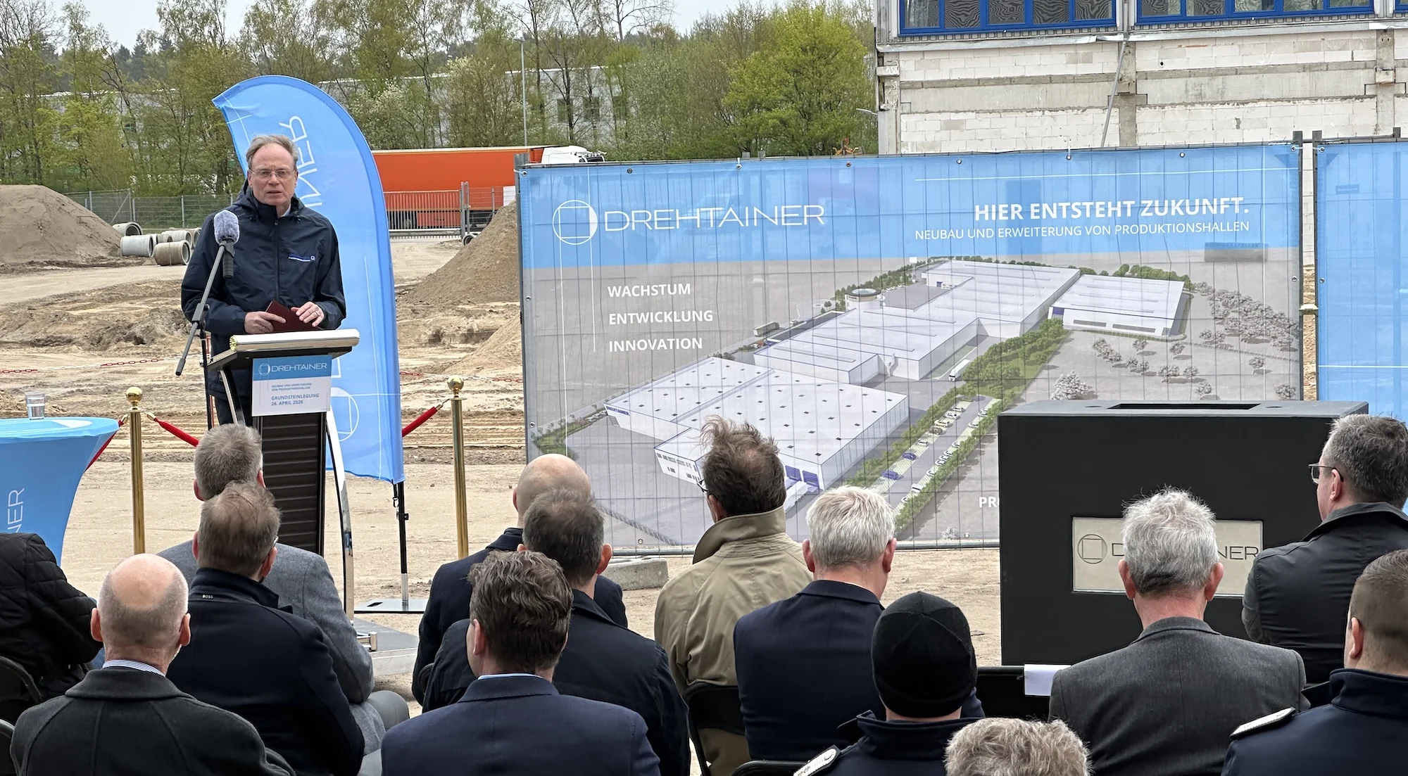 Die Veranstaltung begann mit der offiziellen Begrüßung und Einführung in die Bauvorhaben durch Jens Schlüter, Geschäftsführender Gesellschafter der DREHTAINER GmbH. Im Anschluss richtete Philipp Schack, Mehrheitsgesellschafter des Unternehmens, das Wort an die Gäste aus Politik, Gemeindevertretungen und Wirtschaft und beleuchtete in seiner Rede die strategische Ausrichtung sowie die Hintergründe der Investition.