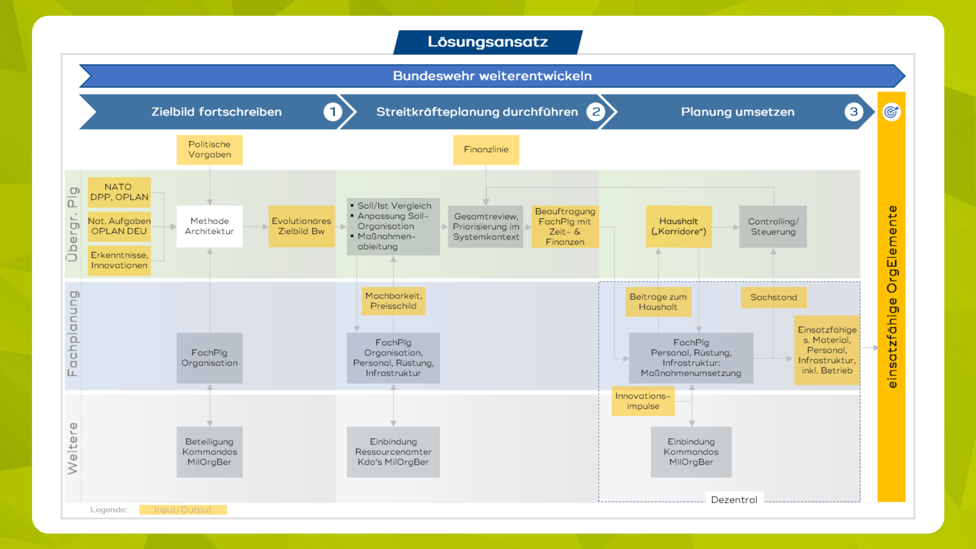 Zentrales Merkmal des Ansatzes „Bundeswehr weiterentwickeln“ ist die klare Ausrichtung auf das Gesamtergebnis und die dafür notwendigen Ergebnisse in allen Teilprozessen. Eindeutige Zieldefinitionen, klare Rollenzuordnungen und eine durchgängige Ergebnisverantwortung bilden den Rahmen.
