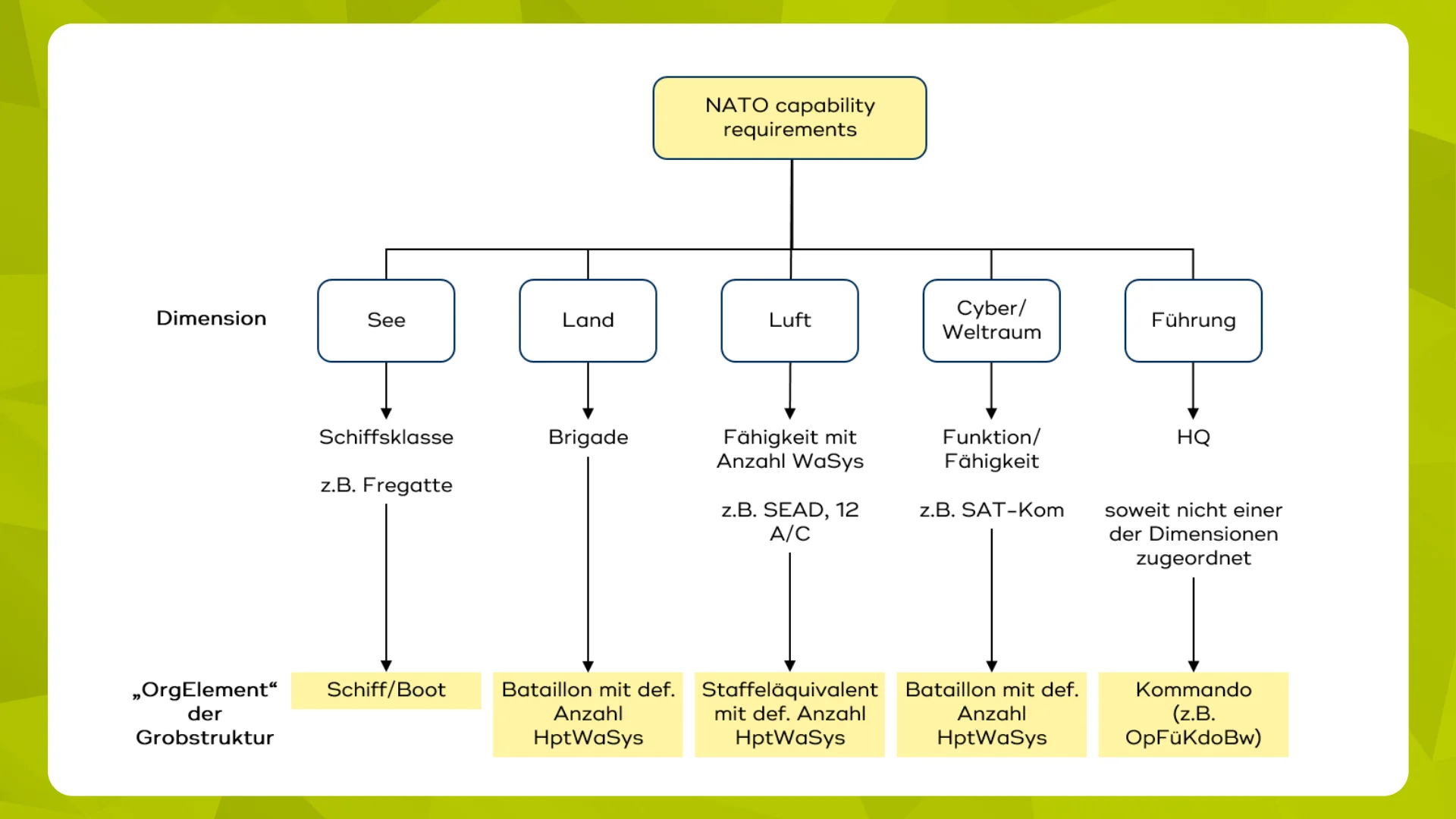 Die Summe aller Organisationselemente ergibt die Grobstruktur, die planerisch als Zielbild auf der Zeitachse anzusteuern ist. Die Wirksamkeit eines Organisationselements ergibt sich aus seiner Organisationsform, der personellen und materiellen Ausstattung, der verfügbaren Infrastruktur sowie der Ausgestaltung des Betriebs. Diese Größen werden in den Fachplanungen der sogenannten Planungskategorien (Organisation, Rüstung, Personal, Infrastruktur, Betrieb ) ausgestaltet.