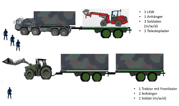 Aktuell muss der Transport-LKW einen Gabelstapler auf Tiefladeanhänger mitführen, kann also nur ein einzelnes Flat oder eine einzelne Pritsche mit Material anliefern. Oder es muss vor Ort ein Feldumschlagsystem mit Personal verfügbar sein. Als Zusatznutzen bei der traktorbasierten Transportlösung muss die Reduzierung des Personalbedarfs – von mindestens 50% – sowie die höhere Geländegängigkeit genannt werden. Die Reduzierung des Personalbedarfs und die Verdopplung der Transportkapazität wird in der Grafik unten deutlich.