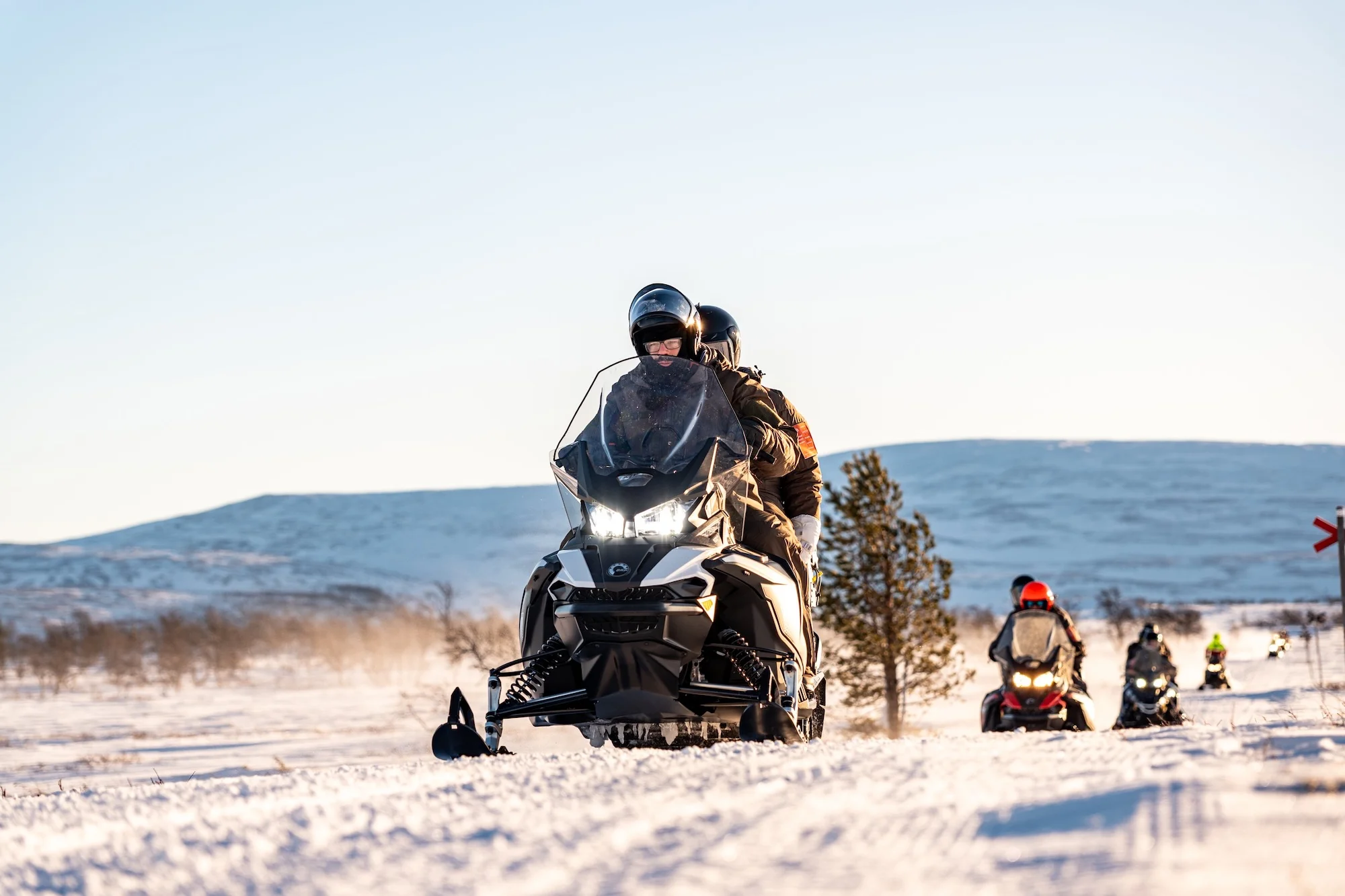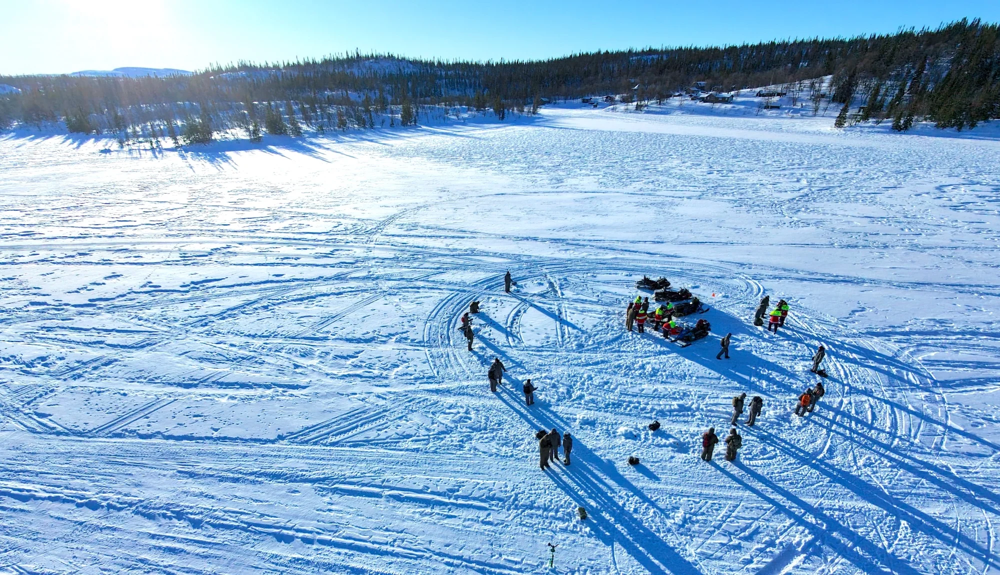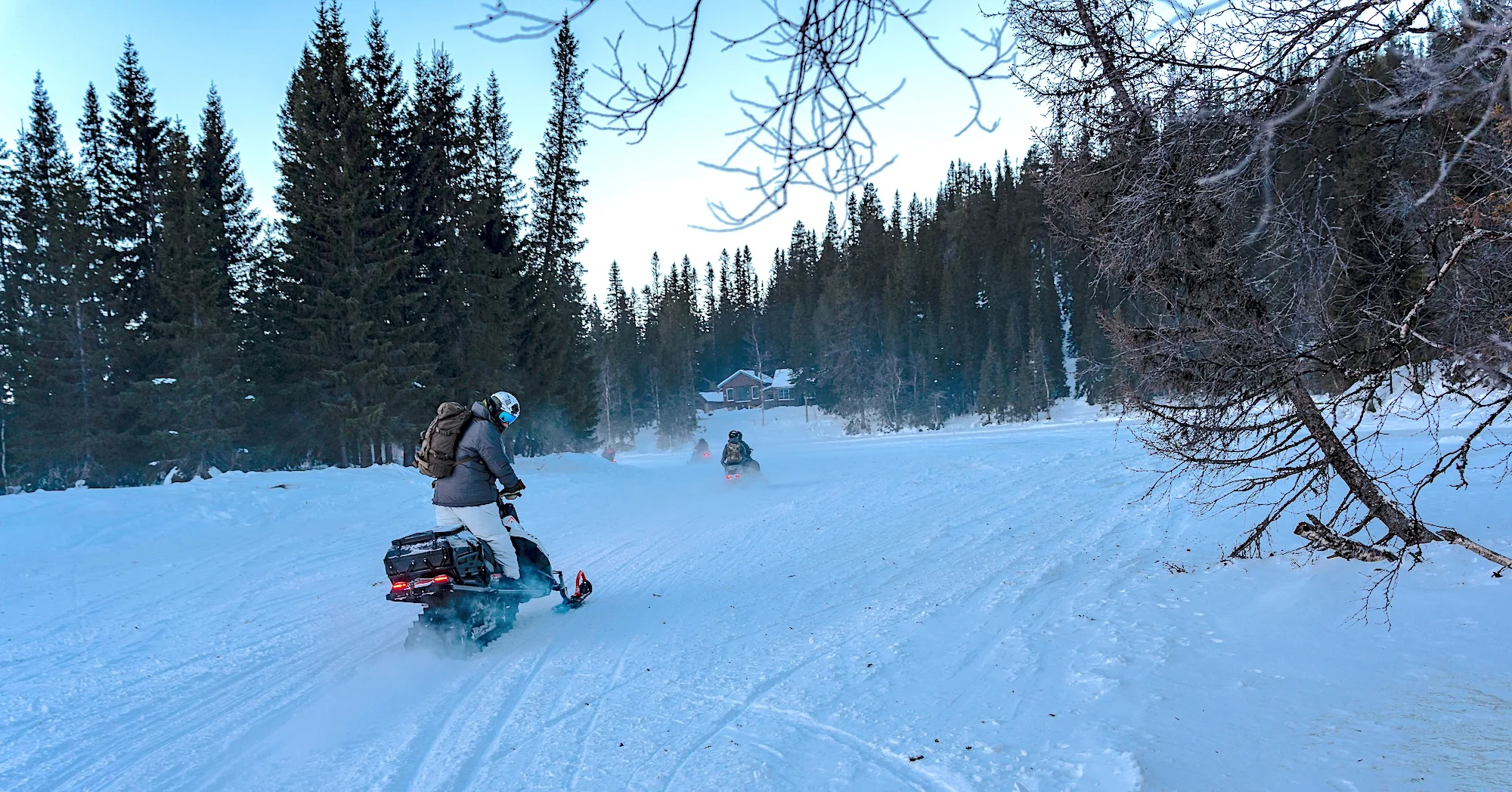 Mit dem Schneemobil fahren wir vom Dorf Bydalen kommend über zugefrorene Bäche und durch dichte Nadelwälder. Rund eine Stunde geht es nördlich. Irgendwann lichtet sich der Wald, der Berg verwandelt sich in ein eisbedecktes Hochplateau.