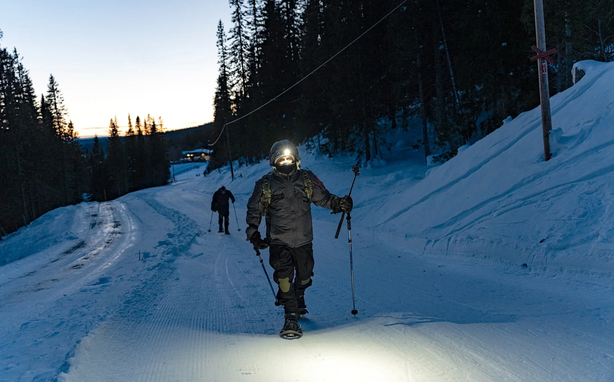 Die Gruppe zieht sich – manche haben mit der Steigung eines Hügels zu kämpfen. Immer wieder versinkt jemand im Schnee, wenn er den von einem Soldaten der schwedischen Armee vorgezeigten Weg verlässt. Der Stau gibt mir die Gelegenheit, meine äußere Schicht – Layer 3A – auszuziehen und in den Rucksack zu stopfen. Eine gute Entscheidung.