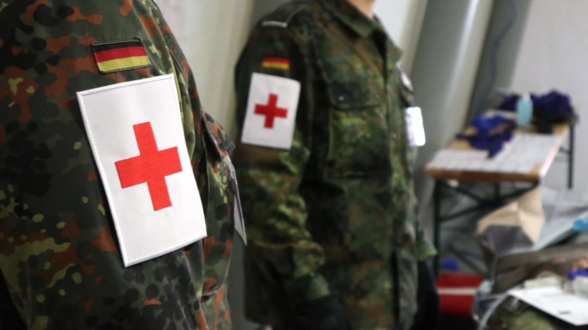 Die Kameraden hier im Bild tragen das Rote Kreuz als Schutzzeichen. In ihrer eigentlichen Verwendung sind sie Militärmusiker.