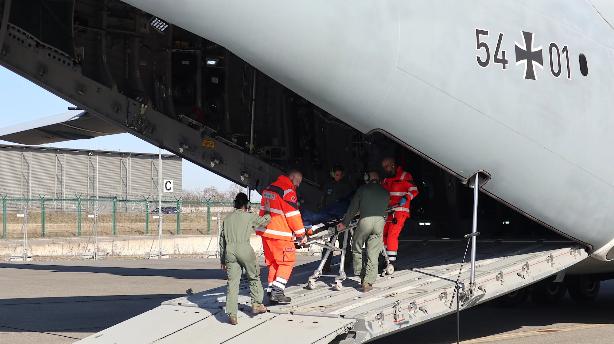 Die Schnittstelle zwischen Militär und zivilen Kräften – Notfallsanitäter der Johanniter-Unfall-Hilfe übernehmen eine verletzte Soldatin aus einem A400M der Bundeswehr.
