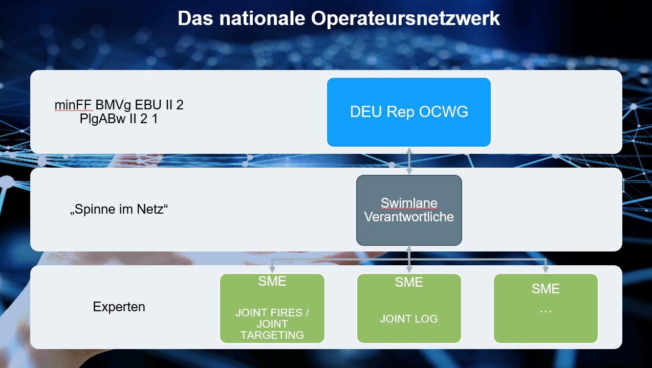 Die zweite Hauptaufgabe besteht darin, die Festlegungen der OCWG an die nationalen Operateure und Entwickler weiterzugeben. Hierzu wurde ein Operateursnetzwerk gebildet. Dieses besteht im Wesentlichen aus Operateuren auf Höhe der Kommandobehörden und ist damit erster Ansprechpartner, wenn es um operationelle Fragestellungen geht. Durch die direkte Zusammenarbeit mit den Experten ist es möglich, schnelle und zielgerichtete Lösungen zu entwickeln.