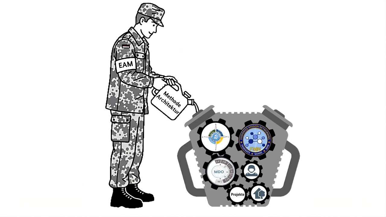 In der MDO-Initiative bildet EAM die Grundlage, um sensorische, kognitive und operative Ebenen domänenübergreifend zu integrieren. Die OpArchFüFä Bw schließlich nutzt EAM als methodischen Rahmen, um Führungsfähigkeit ganzheitlich und zukunftsorientiert zu modellieren.
