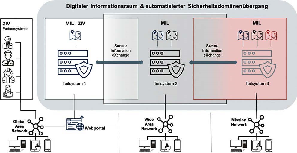 Der sicherheitsdomänenübergreifende Informationsaustausch macht ein gemeinsames zivil-militärisches Lagebild (civ-mil COP) in nahezu Echtzeit möglich. Das „neue“ erweiterte Lagebewusstsein schafft die Basis für den bekannten Dreiklang von Informations-, Entscheidungs- und Wirkungsüberlegenheit für die Gesamtverteidigung Deutschlands.